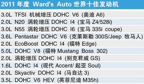 日前,美国汽车媒体Ward's Auto World评选出了“2011年度Ward's Auto世界十佳发动机”。宝马和福特各有两款发动机入选,增压和直喷技术垄断了本年度十佳榜单。马自达创驰蓝天技术发动机也当之无愧入选。