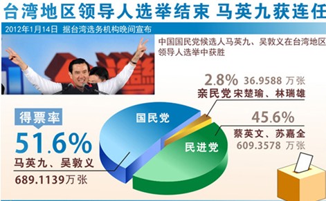 14日,台湾地区领导人与民意代表两项选举结果揭晓。马英九以689万多票、51.6%的得票率获得连任。另两组候选人中,民进党候选人蔡英文、苏嘉全得票6093578张,得票率为45.6%;亲民党候选人宋楚瑜、林瑞雄得票369588张,得票率为2.8。在台湾民意机构总共113个席次中,国民党获64席,民进党获得40席。蔡英文在败选后宣布辞去民进党主席职务。中台办、国台办发言人14日发表谈话称,我们注意到台湾地区领导人和民意代表选举结果已经揭晓。近四年来的事实一再表明,两岸关系和平发展是一条正确的道路,得到广大台湾同胞的支持。我们真诚希望台湾社会安定、人民生活幸福。我们愿意继续在反对“台独”、坚持“九二共识”的共同基础上,与台湾各界携手努力,承前启后,继往开来,进一步开创两岸关系和平发展的新局面,共同致力于中华民族的伟大复兴。